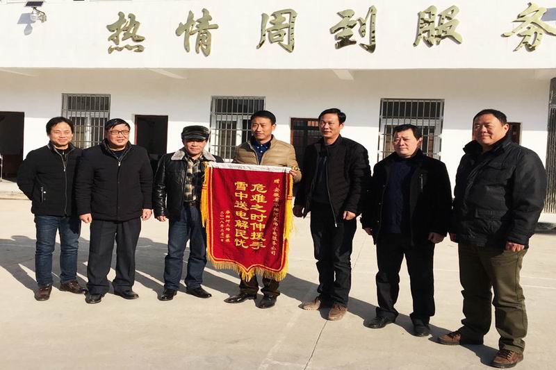 真不知道该怎么感谢你们才好啊!农场领导得知停电给我的养猪场造成困难,安排水电公司帮我很快解了燃眉之急,实在太感谢了!26,华阳河三场专业户蔡旗将一面危难之时伸援手,雪中送电解民忧的锦旗送到农场水电服务公司,现场表达了诚挚的谢意。