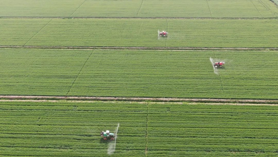 在无人机“主攻”的同时,自走式喷雾机、小孔径喷头设备等传统植保机械同步发力。淮南农场7台自走式植保机“分田包干”,300亩麦田半小时完成作业;东风湖农场投入8辆自走式喷雾机,与3台无人机形成“空地联动”,4月20日前将完成9393亩小麦首防任务。针对复杂地形或连片大规模农田,传统机械凭借稳定性和适应性,与无人机形成优势互补,确保防治全覆盖。寿西湖农场推广“一喷多效”技术,在传统器械作业中同步添加微肥,实现“防病治虫、促壮抗逆”综合增效。