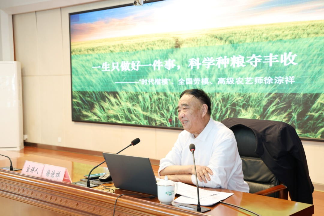 在宣讲报告会上,徐淙祥围绕学习贯彻习近平总书记重要回信精神,以《一生只做好一件事,科学种粮夺丰收》为题,结合53年扎根农村的实践经验,分享种粮技艺,分别讲授了“我国农业发展的三个阶段”“习近平总书记三次亲切鼓励”“遵循嘱托坚决扛稳国家粮食安全责任”“打造国内一流多种粮、种好粮生产示范基地”“四项小麦优质高产种植关键技术”等方面内容。他特别分享了种粮生涯中总结的20项小麦绿色高效种植关键技术措施,以及将技术要点编成的120首种植谚语,让复杂技术变得通俗易懂。