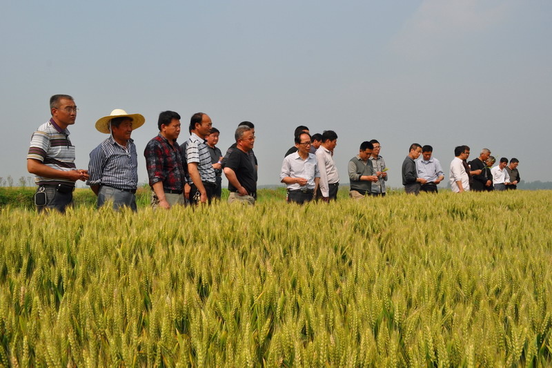 520,滁州市种子管理站专家和种子经销商正在安徽省最大的小麦原良种繁育基地——潘村湖农场察看小麦长势。进入5月中旬以来,各地专家、种子经销商和种田大户纷纷来到农场实地观摩小麦种子田生长情况,并根据小麦形状、纯度、抗性等现场选订中意的麦种。(安徽日报2014522A1版,杨登宏摄)