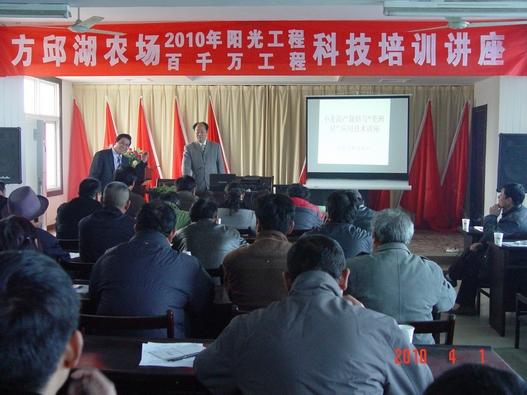 2010年4月1日,方邱湖农场举办了第一期“阳光工程”暨“百千万”农业科技培训讲座,邀请了安徽省农科院神农农业技术服务公司朱永平总农艺师来场,重点讲授了“小麦高产栽培与美洲星应用技术”等主题内容,并对该场小麦中后期管理进行了现场指导。全场科技示范户、种田能手及各单位农业管理人员近120人参加了科技培训,效果良好。