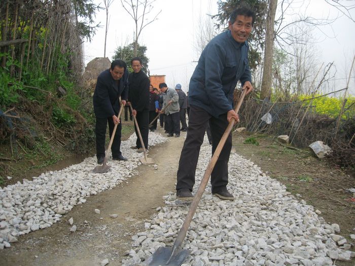 退休农工、74岁的老党员陈业海年轻时就是个积极分子,今年春节他又有了一个计划,发动退休农工“做点善事”。经过悄悄地串联,做工作,队里的老人二话不说,纷纷响应,每人至少出一百,短短一个礼拜,就凑足了7000多元。大家民主推选几个老人组成了一个理财小组,张榜公布捐款名单,同时委托队长陈多银负责项目施工,对开支情况实行帐务公开。身体硬朗的几位老人还亲自投劳,义务参加施工,当起了“义工”。