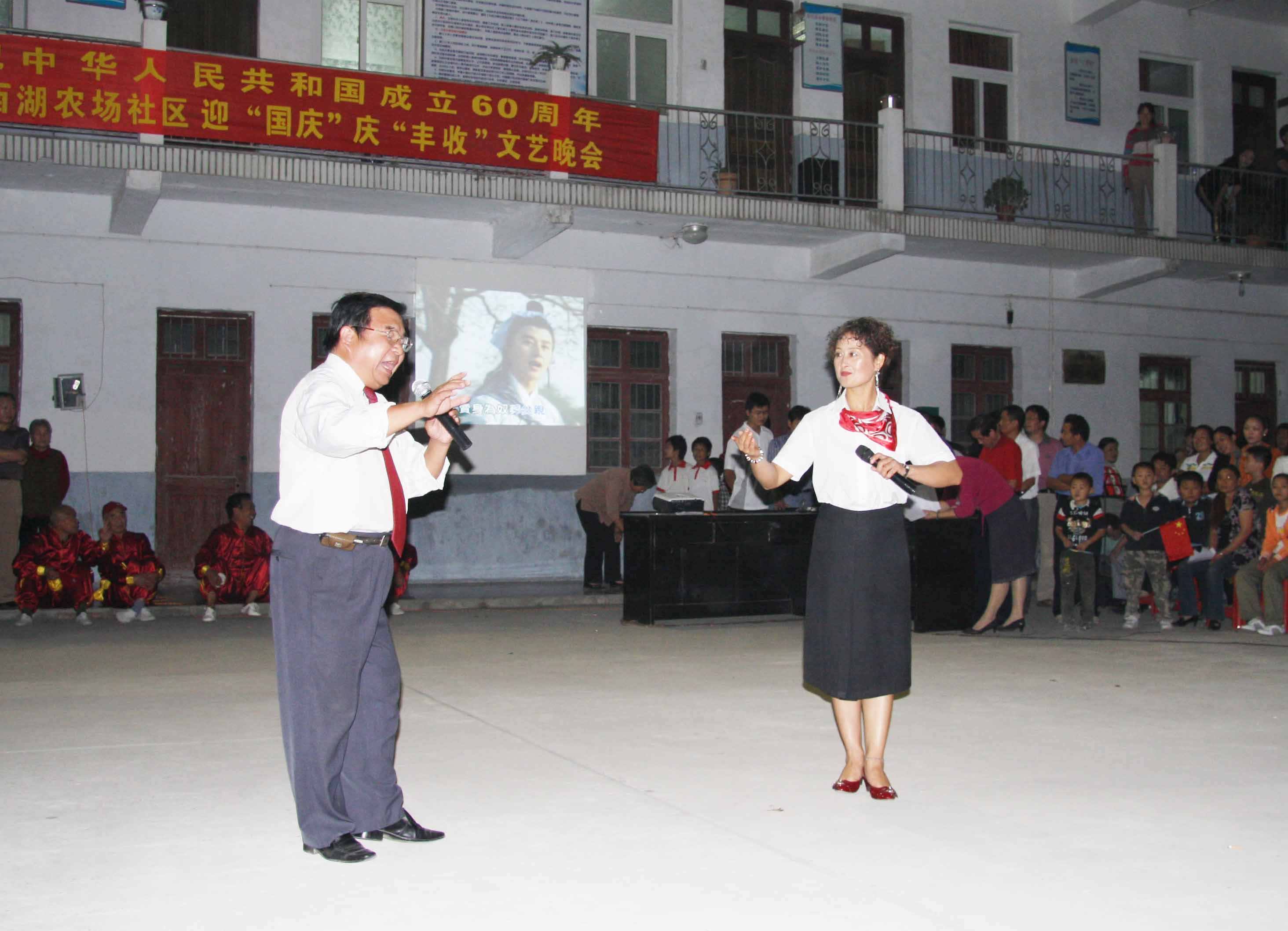近年来,寿西湖农场在创建文明、和谐社区方面取得了优异成绩,社区各项事业蓬勃发展。为庆祝我们党的60华诞,歌颂我们伟大的祖国,进一步活跃居民文化生活,社区编排了一些富有社区气息、形式多样的精彩文艺节目,奉献给大家。晚会在威风的《寿州锣鼓》中拉开序幕,接着有声情并茂的独唱、振奋人心的合唱、精彩的集体舞蹈、高超的武术表演,还有别具风格的管弦乐演奏和时尚动感的现代健身操等优秀的节目。晚会上演员和居民们载歌载舞、激情澎湃,热烈庆祝我们伟大的节日,讴歌我们美好的生活!欢歌、笑语和掌声此起彼伏,整个广场变成一个欢乐的海洋。最后,晚会在男女合唱《走进新时代》的歌声中圆满结束。