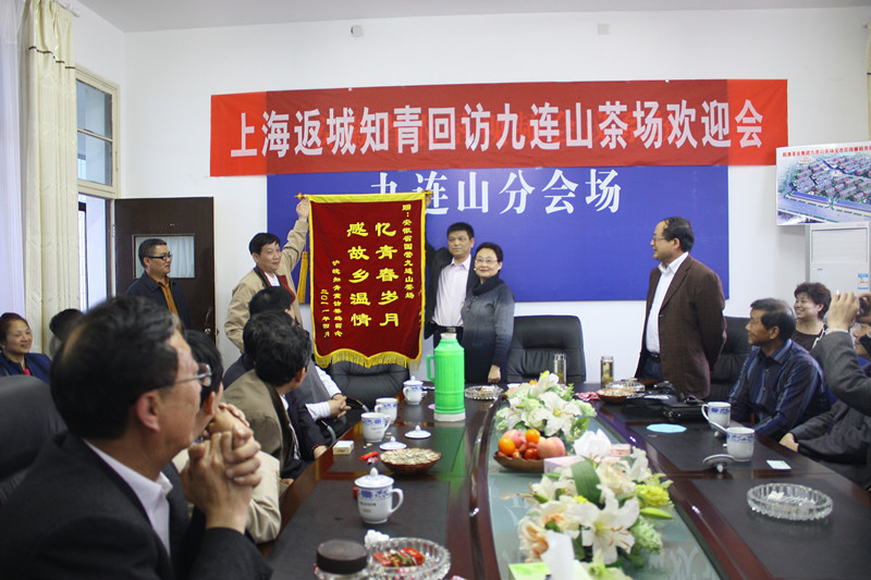 沪皖知青代表将一面书写着忆青春岁月、感故乡温情的锦旗赠送给茶场以表留念。茶场老同志蒋浩田即兴赋诗词一首:最忆是知青,昔日同心建茶场,血汗共铸真挚情,能不忆旧情。四十年后重聚首,各自儿孙绕膝行,时变迁,友谊存,相见无语泪满襟,常相聚,返故园,回忆使人变年轻,他年若再重会面,必然是,满目青山夕照明。