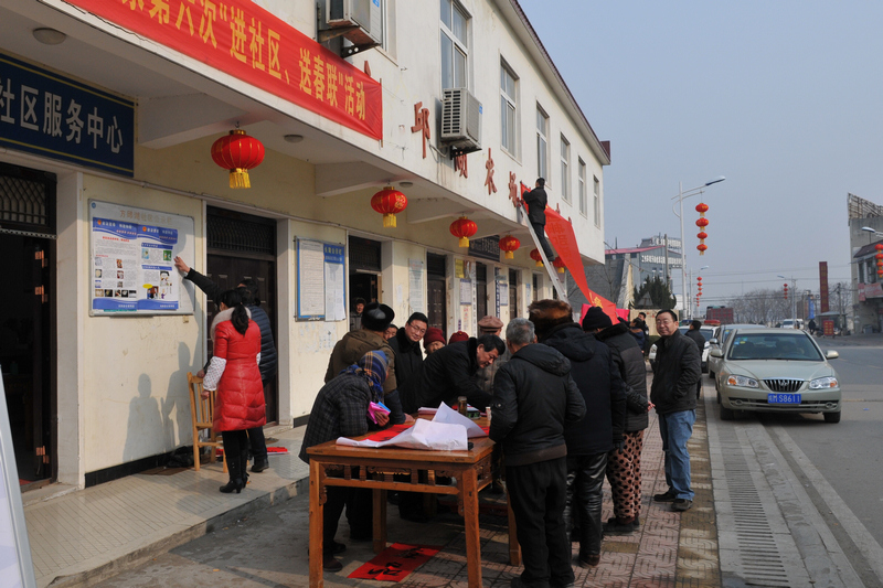 25,猴年春节将至,方邱湖农场梅山花园职工小区内,火红彩旗随风飘,大红灯笼高高挂,洋溢着浓浓的过年氛围。当天上午,凤阳县法官警官莅临社区向居民义务宣传珍爱生命、远离毒品和严禁赌博等违法行为,县法院及农场书法爱好者现场书写赠送春联560多幅。社区居民们怀着喜悦的心情,听警官讲解、看宣传展板、领普法资料,排队等候自家满意春联,一派欢乐祥和景象。