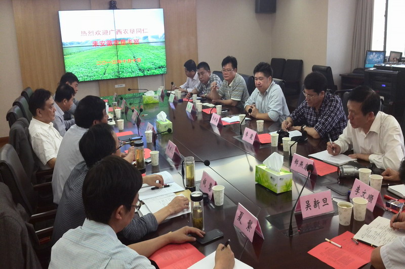 1010,广西农垦局土地资源管理部门及西江房地产开发建设有限公司一行8人到安徽农垦考察交流土地管理、房地产开发、垦地合作等工作,安徽农垦集团副总经理程军率土地建设规划部、经济合作开发部、通和房地产集团及宣城公司、皖垦茶业集团负责人参加了座谈交流。(万亮)