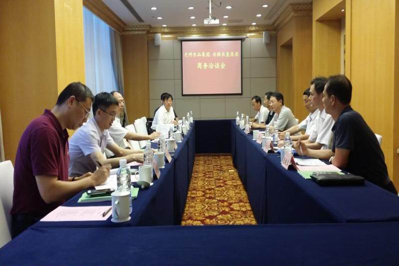 为积极响应农业部农垦局提出的联合联营联盟战略,加强垦垦合作,推进创新转型发展,825,安徽农垦集团总经理刘超偕副总经理李家堂、陈仁虎一行,赴上海与光明食品集团董事长是明芳、副总裁张汉强等洽谈战略合作。