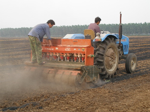 6月10日下午,安徽省潘村湖农场四分场一块大田里,机声隆隆,尘土飞扬,该场薛波家庭农场正在使用集旋耕、播种、覆盖为一体的复式耕作机械播种玉米。