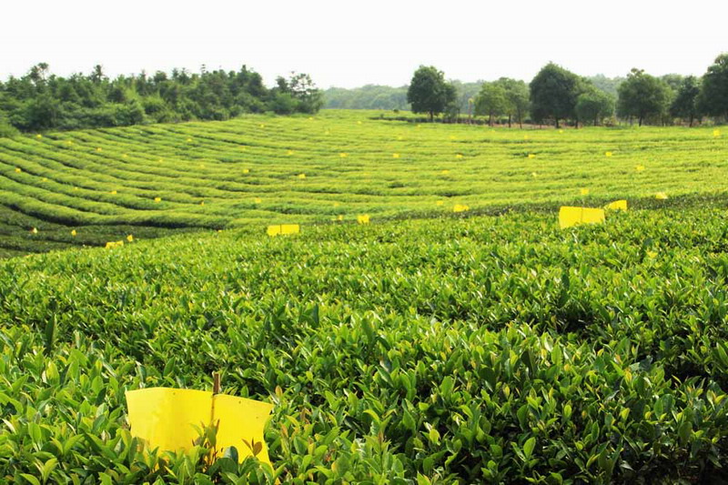 为从源头把好茶叶生产安全关,十字铺茶场在茶树病虫害防治上,积极推广物理防治病虫害——黄板诱杀虫技术。