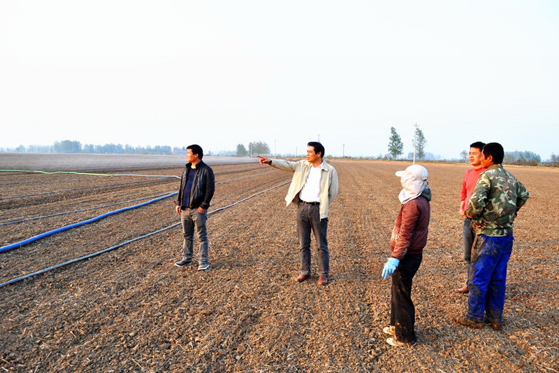 为积极应对今年秋种以来多日无雨的不利天气,连日来,潘村湖农场广大职工家庭农场在农技人员指导下,积极开展灌溉作业,力保秋种小麦一播全苗,为实现壮苗越冬打好基础。图为场长柏华胜1022日在生产一线检查指导灌溉工作的情景。(杨登宏)