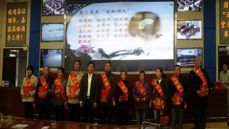 颁奖式上,荣获第二季度见义勇为宿松好人的农场退伍老兵任在林(图片右一)上台领奖,他勇救落水儿童的英雄事迹在宿松县广为流传。(程来保)