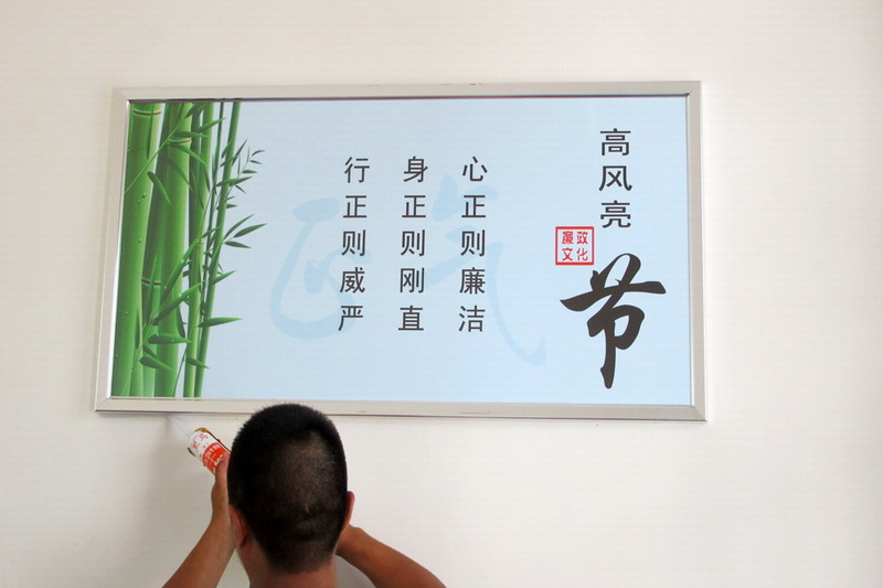 自去年底在场部机关悬挂廉洁标识语匾牌以来,农场党委今年将此举向基层、社区延伸,按照《廉洁文化建设实施方案》的要求,稳步推进创建活动,力促六进、四上,形成了贴近实际、凸显特色、入脑入心的廉洁文化品牌,营造了农场崇廉尚廉守廉的浓厚氛围。(石野兵)