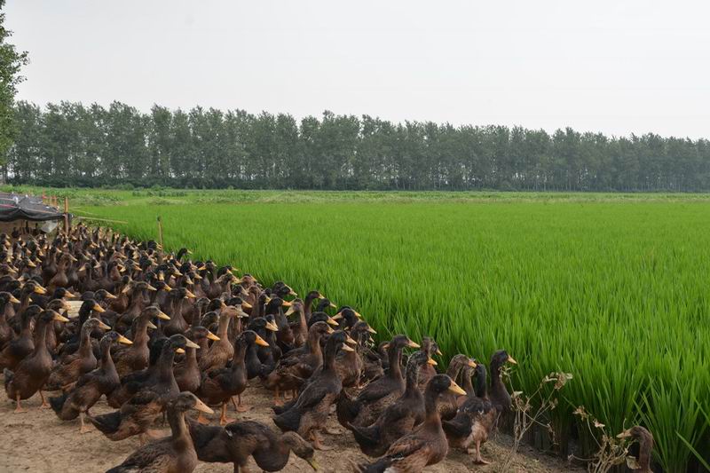 稻鸭共生是一种节本增效的绿色生态农业模式。安徽农垦大圹圩农场2013年开始在有机稻基地进行稻田养鸭试点,初试大获成功,当年效益颇丰。稻鸭混养今年已在农场150多亩有机稻田得到全面推广。