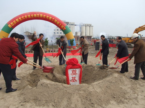 春风送暖,万物复苏。3月12日,龙亢农场龙翔花园职工住宅楼工地上彩旗飘扬,鞭炮齐鸣,锣鼓喧天,当最后一锨黄土覆盖住奠基石碑,宣告惠及全场职工福祉的德政工程——龙亢农场社会主义新农村建设龙翔花园职工住宅楼正式开工。集团公司领导田文俊、李卓民、刘超、李家堂、集团公司各处室负责同志、场领导杨俊宇、朱为荣、张建民、刘梅、李应河、程希文、全体机关工作人员、农业分场干部、雁湖面粉公司部分领导、监理单位代表、施工单位代表以及部分场区职工群众等参加奠基仪式,场党委副书记张建民主持开工奠基仪式。