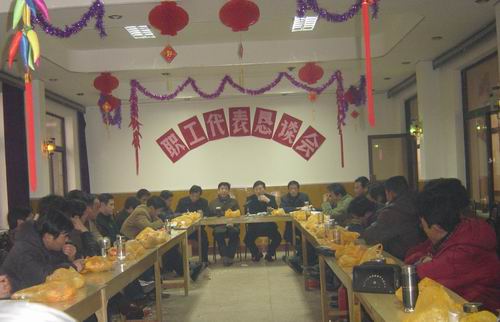 2月7日下午,大圹圩农场机关四楼会议室内张灯结彩,春意融融,场职工代表恳谈会正在这里召开。场领导徐成银、施广庆、殷文格、杨朝幸同来自全场各单位各部门的50多名职工代表共聚一堂,辞旧话新,共谋农场改革发展大计。