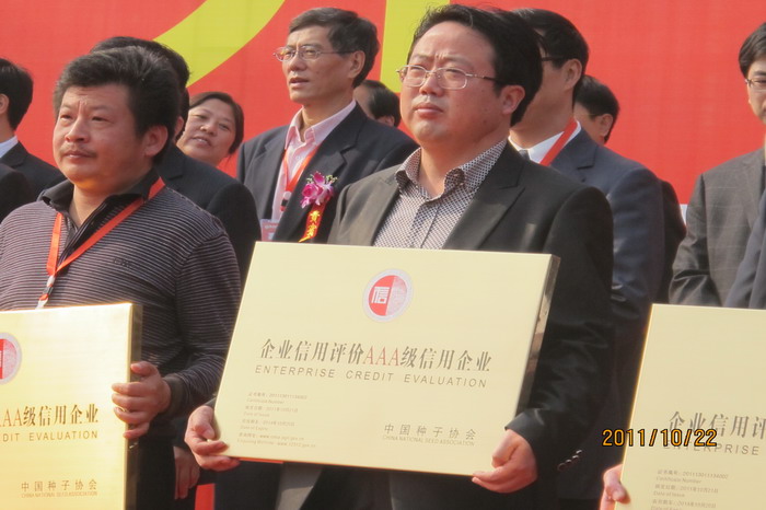 会议选举产生了中国种子协会第五届理事会,皖垦种业再次当选为理事单位。会上,中国种子协会公布了2011年全国种子企业信用评价结果,皖垦种业被评为中国种子行业AAA级信用企业,由国家农业部党组成员、中国种子协会会长梁田庚亲自授牌
