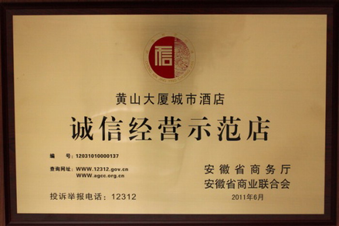 黄山大厦城市酒店荣获全省诚信经营示范店称号