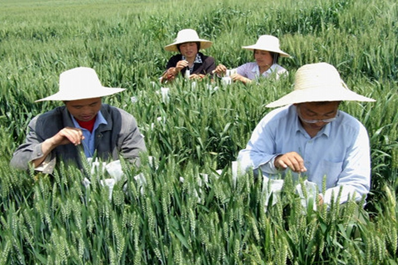 图为:农场农业科技人员在做小麦杂交授粉(李峰)