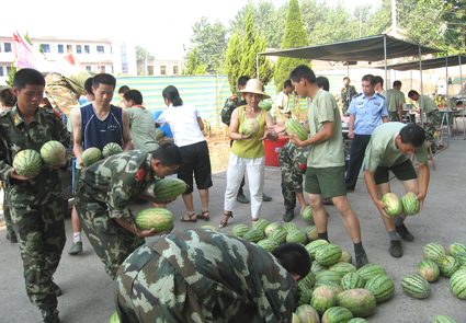 今年的8月1日,是中国人民解放军建军80周年纪念日。一大早,焦岗湖农场就将满满两四轮西瓜送往武警官兵临时住地----焦岗湖农场一分场和鲁口中学。