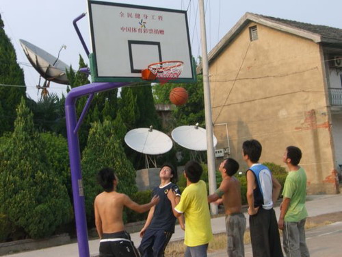 7月底,由省体育局和省民委牵手打造的全民健身阳光工程落户省农垦皖河农场三益回民分场(相当于村)。价值1.2万元的体育器材包括乒乓球桌两台、新式篮球架一副,分别捐赠给该场马店回民小学、回民老年人活动中心和农场机关篮球场。据了解,此次安徽省体育彩票捐赠活动共计15万元,面向全省10个民族村,皖河农场是安庆市唯一获赠单位。图为农场子弟体验新篮球运动。