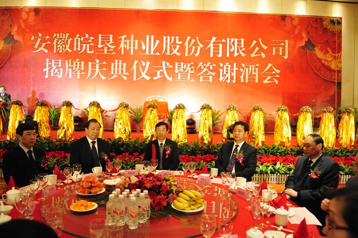 326安徽农垦第一家股份公司——安徽皖垦种业股份有限公司揭牌庆典仪式在合肥政务新区天鹅湖大酒店隆重举行。省人大、省政府、省政协、农业部农垦局及有关部门领导同志出席庆典仪式,安徽省人民政府副省长黄海嵩和农业部农垦局局长李伟国共同为皖垦种业股份有限公司揭牌。仪式由农垦集团副总经理、皖垦种业总经理王占廷主持,省内外200多家企事业单位到会祝贺。