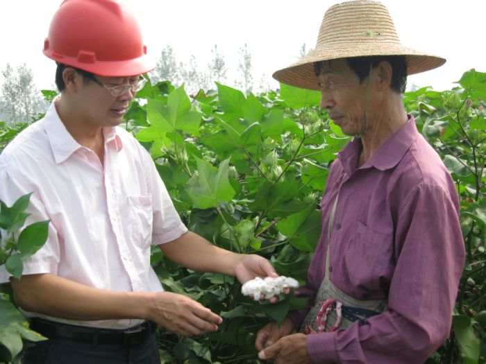 9月上旬以来,皖河农场棉农开始陆续采摘新棉。前期受低温阴雨天气影响,棉花不同程度出现烂铃现象。农场针对这一现象适时引导棉农采取化控、抹水杈、页面喷肥、及时采摘等科技措施降低损失,增加后劲。目前棉花长势总体较好,预计亩产可达300公斤。图为农技人员向棉农了解新棉生长情况。