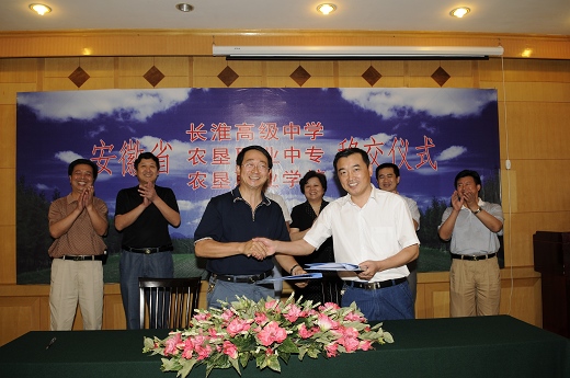 在省委省政府的高度关心重视下,在省国资委、省财政厅、省教育厅、省人事厅、省劳动和社会保障厅、省编办的大力支持下,安徽省长淮高级中学(农垦职工中专学校、职业学校)今天正式移交给长丰县人民政府。7月7日上午,由省国资委牵头监交和合肥市人事局的见证下,省农垦集团公司副总经理刘超受省国资委托主持了仪式并代表农垦集团公司与长丰县人民政府常务副县长沈成富共同在合肥签署了安徽省长淮高级中学(农垦职工中专学校、职业学校)移交协议。