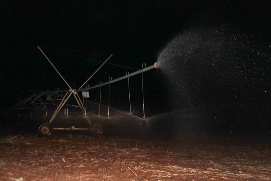 按时播种是前提,及时灌溉是保证。为克服白天无电的困扰,皖津公司利用夜晚有电之隙,能喷即喷。517日夜,随着马达声起,第一滴甘露喷洒入地,拉开了小麦喷灌序幕,修复后的喷灌机状态良好,旋转的龙头强劲有力,喷洒的雨露滋润人心。