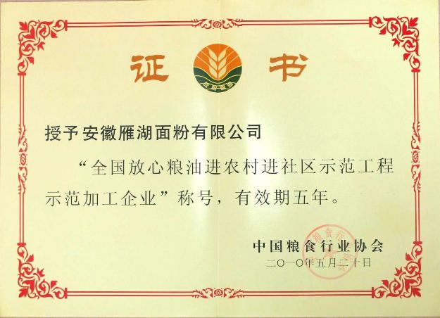 日前,皖垦食品集团雁湖面粉有限公司被中国粮食行业协会评为“全国放心粮油进农村进社区示范工程示范加工企业”。