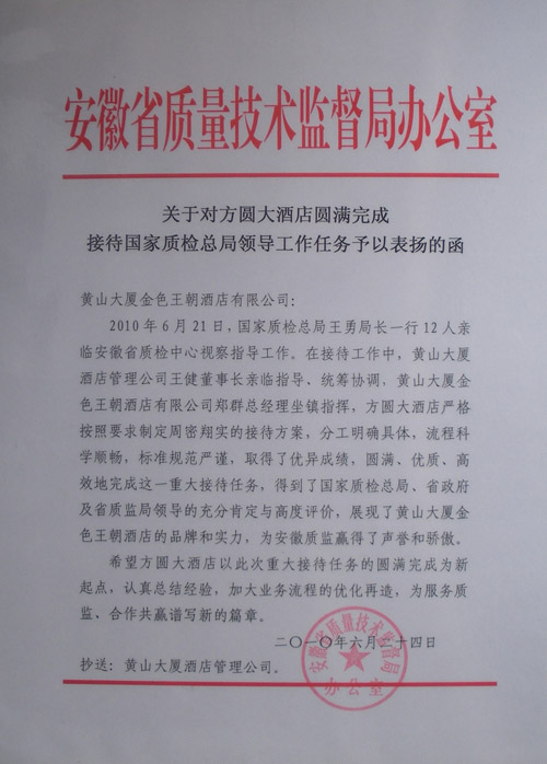 日前,安徽省质量技术监督局致函安徽农垦黄山大厦金色王朝酒店有限公司,对公司旗下方圆大酒店圆满完成国家质检总局来皖视察指导工作的接待任务加以表扬。