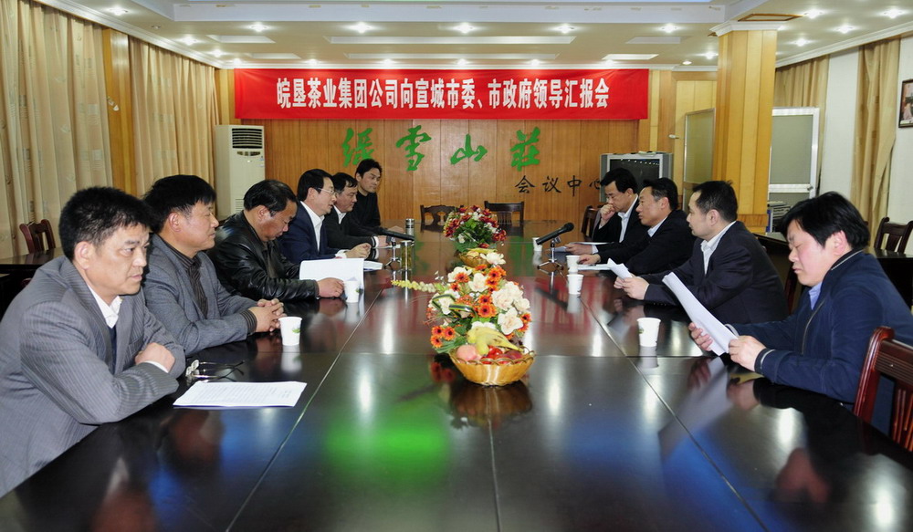 敬亭绿雪春茶开采前夕,319日下午宣城市市长虞爱华率副市长郑宏、市政府副秘书长、办公室主任郑明才和市农委副主任陈海林等专程来到刚刚扬帆启航的皖垦茶业集团视察指导,省农垦集团公司副总经理、皖垦茶业集团董事长刘超率茶业集团总经理孙国安、茶区总场场长张国祥和茶业集团副总经理邱升水、宗志贵在敬亭山茶场绿雪山庄迎接虞市长一行,双方在绿雪山庄进行了热情友好地座谈。省农垦集团公司副总经理、皖垦茶业集团董事长刘超首先对虞爱华市长在皖垦茶业集团成立之初即亲临指导表示热烈欢迎,并向虞市长一行汇报了皖垦茶业集团组建情况和经营发展思路,现场推介了敬亭绿雪“至尊、贵尊、荣尊、白茶”包装新款,就实施敬亭绿雪品牌战略恳请宣城市委市政府给予大力支持。
