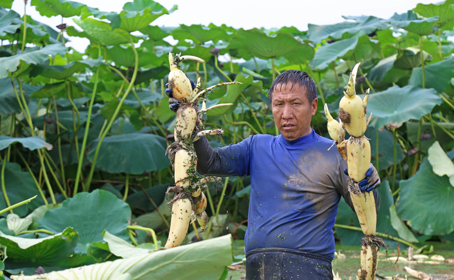 8月18日,华阳河农场公司的藕田里,藕农在采挖鲜嫩的莲藕。近年来,华阳河农场公司依托湖泊群天然优质水资源,积极调整种植结构,发展绿色生态莲藕种植,面积近万亩。目前,莲藕开始采挖,采挖期从今年8月到明年4月,产品主要销往广东和广西“两广”市场,亩均产值约6000元,通过绿色生态莲藕种植,带动企业增效、农户增收。(李 龙   摄)