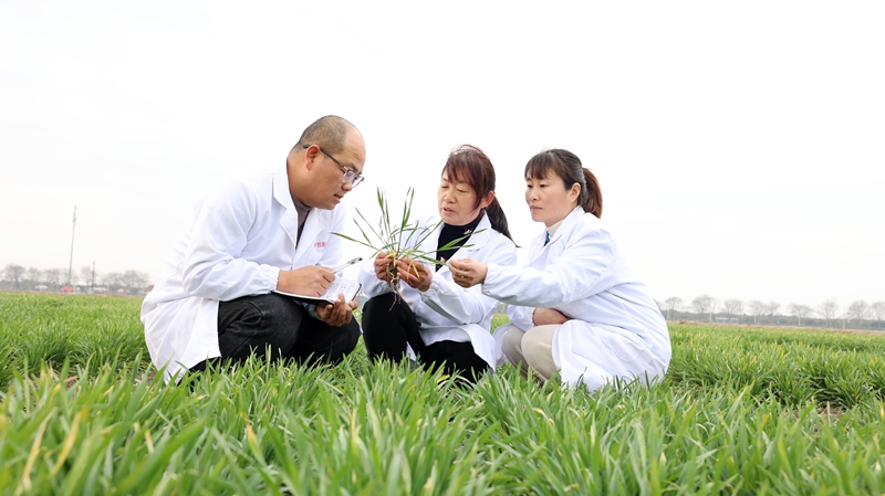 2月18日,龙亢农场公司农技人员对场区及周边托管田块的小麦进行返青期苗情动态监测。李峰  摄