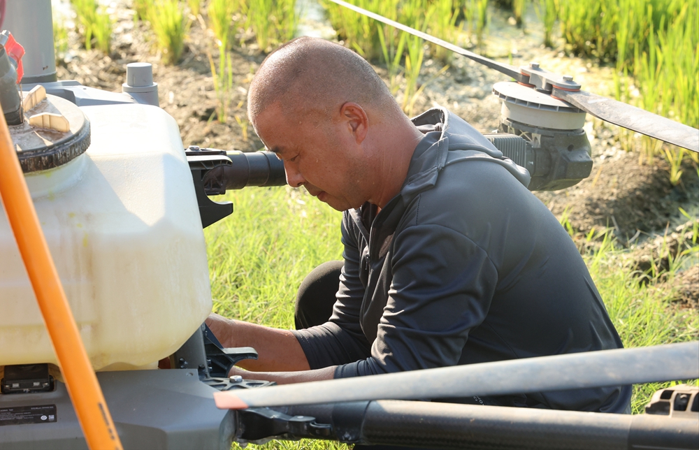 8月5日,龙亢农场公司农业一场无人机操作员正在做起飞前准备。(周文娟 摄)
