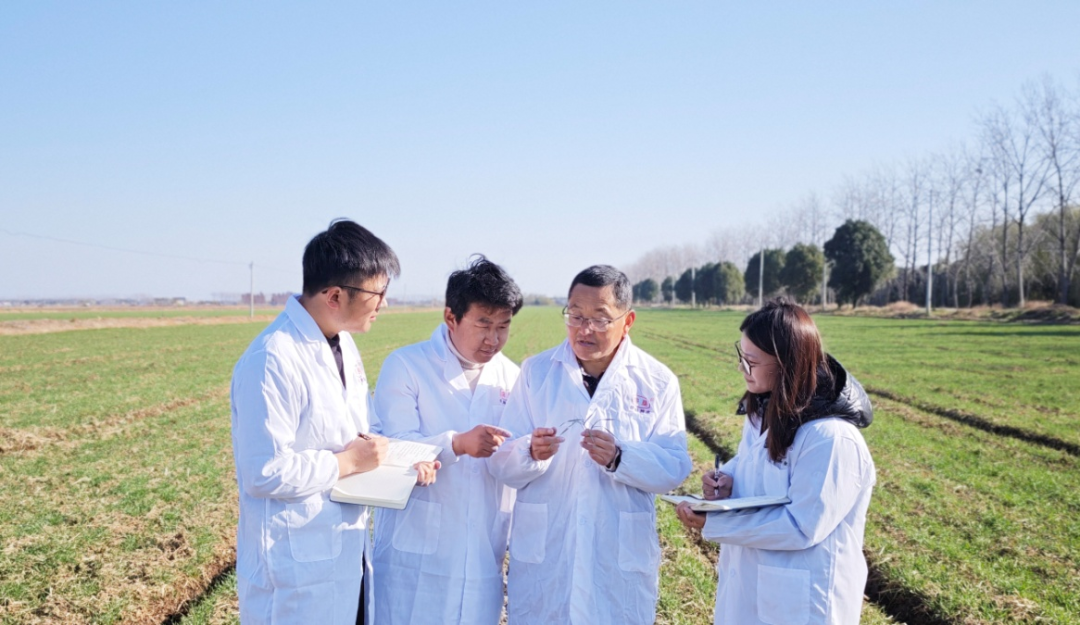 大圹圩农场农技人员正在田间查看小麦苗情。(薛晓旭 摄)