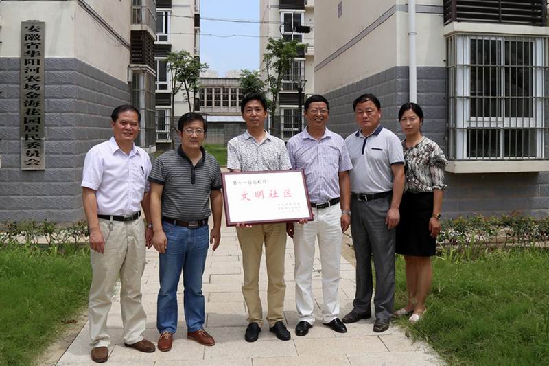 日前华阳河农场金海花园荣评县文明社区称号。810,宿松县委宣传部副部长、文明办主任姜晓蕾一行到场授牌。场党委书记王洪及相关负责人参加座谈及授牌仪式。