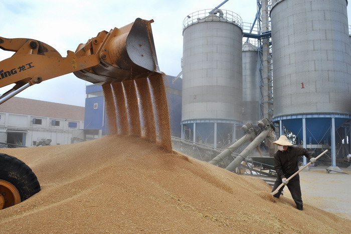 615,在地处明光市的安徽农垦潘村湖农场种子加工中心,工人正在清选小麦种子粮。作为全省最大小麦种子繁育基地,今年该农场3.2万亩小麦原种喜获丰收,平均单产达到1150斤。农场开足10条加工线,加紧清选烘干,目前已入库优质小麦种子3600万斤。(安徽日报619A1版 杨登宏 摄)
