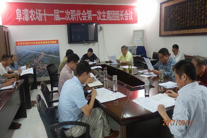 911,阜农场召开十一届二次职代会团组长会议,审议《2017年土地承租合同续签工作方案》。会议由工会主席卢庆忠主持,场领导及职代会各团组长共15人参会。