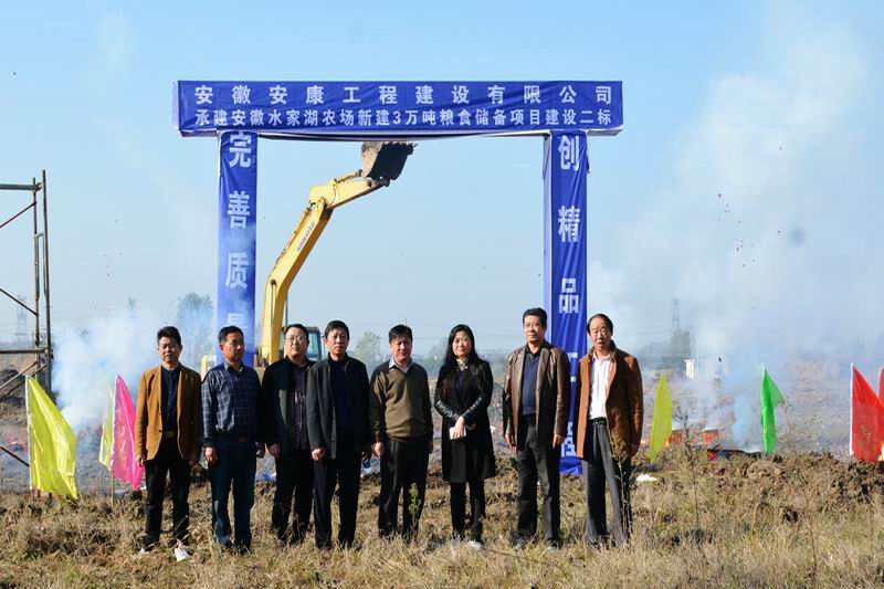 115,水家湖农场3万吨粮食储备库项目动工开建,农场领导及相关部室、监理、施工单位负责人到场督查。