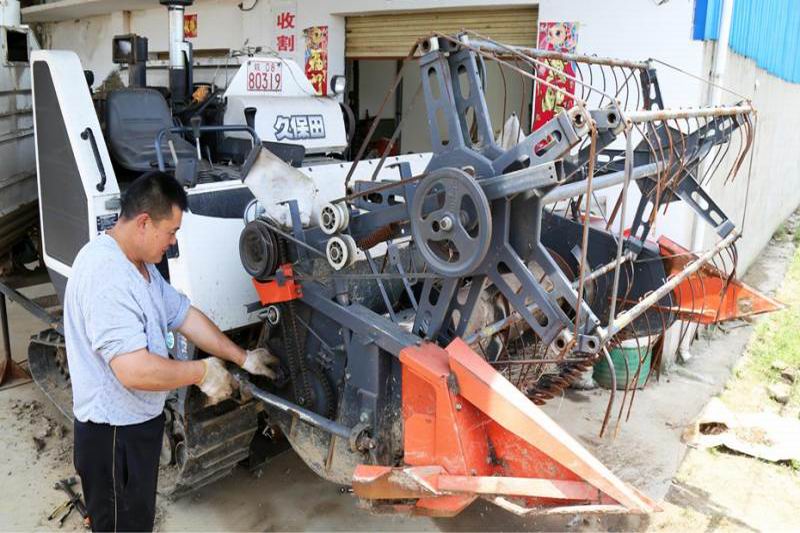 周支援是位农机修理师。他在家门口开了一间机修铺,随着午收临近,他的生意越来越忙。他告诉笔者,从4月中旬开始,来检修机械的人越来越多,有时一天要检修34台,大家为的是午收时省心、省时、省力。