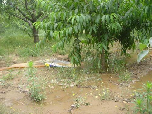 自2007年春节过后的4个月时间内,砀山果园场降雨量仅为120mm,是历史同期水平的1/3。目前果园内土壤的持水量只有7%,特别是在高坡的果园,土壤沙化,树叶萎蔫,旱象十分严重。旱情就是命令。自5月20日以来,砀山果园场积极组织职工抗旱,一是召开动员会,层层发动,全员参与抗旱,机关、分场全体人员深入林眼,督促职工抗旱。二是抓好服务,保证电力供应。供电部门全力以赴,检修用电设施,调节用电负荷,保证抗旱用电量。三是组织检修,调试水利抗旱设施,确保抗旱工作顺利进行,对节水灌溉设施以及机井等调试、检修并投入使用,至2007年5月29日全场抗旱投入500人次,利用机井48眼,节水灌溉系统全面启动,已抗旱浇灌果园面积2000余亩。