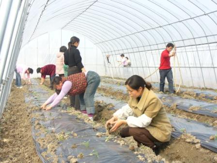 国家现代农业标准化示范场——龙亢农场今年年初投资20万元,新建薄膜温室10亩,从事绿色无公害特菜的试验、示范与推广。该温室工程是该场建设现代农业示范园的重要工程之一,部分温室将作为该场农科所引种特色蔬菜与瓜果品种的试验区、示范区、推广基地;另一部分低价位出租给职工,让他们种植特色水果和蔬菜,由农科所技术人员给予指导和帮助,以此带动更多的职工加入现代农业示范园建设的行列,推动园区发展。 日前该工程已全部投入使用,精心挑选的圣女系列樱桃番茄、名特西瓜等5个新、特、优品种以入棚定植。图为职工正在按标准化要求定植。
