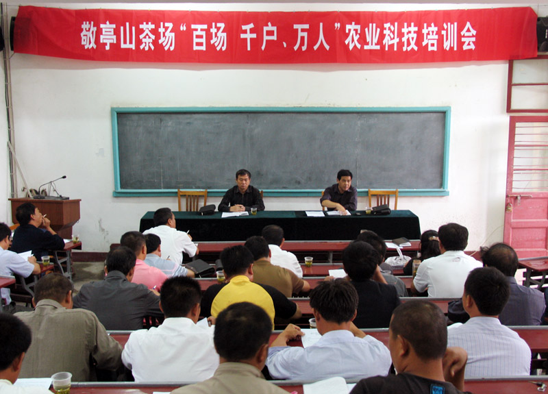 敬亭山茶场认真贯彻落实安徽省农委和安徽农垦事业管理局共同制订的《“百场、千户、万人”农业科技培训行动实施方案》,借助于茶场较为健全的技术服务体系和素质较高的技术推广队伍等科教资源优势,开展“百千万”农业科技培训行动。此活动不仅切实提高了职工科技素质、加快农业科技成果转化、促进农业综合生产效益,提高了职工家庭农场的经济收入,同时,还将茶场拥有的标准化的生产技术规程、先进实用的农业技术推广到茶场周边的农民,使茶场成为农业新技术、新成果推广和普及应用的培训基地,使农民掌握农业生产关键、核心技术,提高农民从事茶业生产经营水平,增产增效增收,为新农村建设又好又快发展提供有力的科技支撑和人才保障。