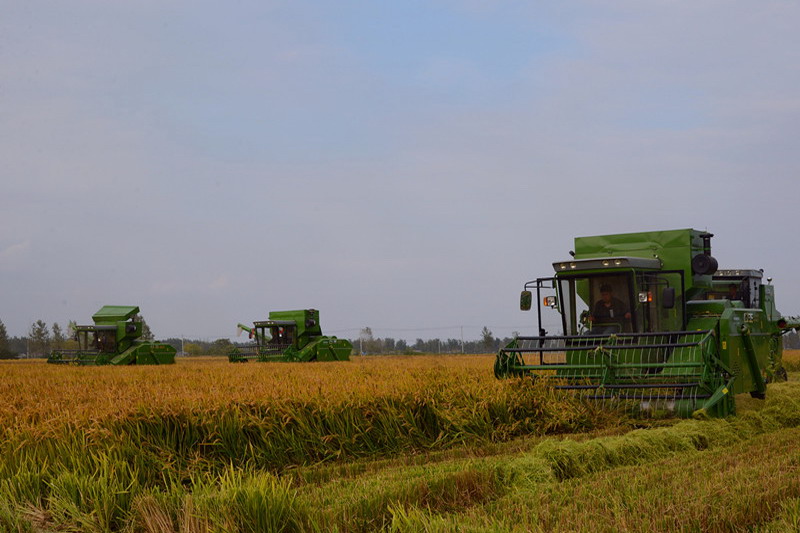 1019,大圹圩农场农业一管区统一经营的林改田里,汇聚了五六台崭新的收割机,正在抢收成熟的水稻良种。