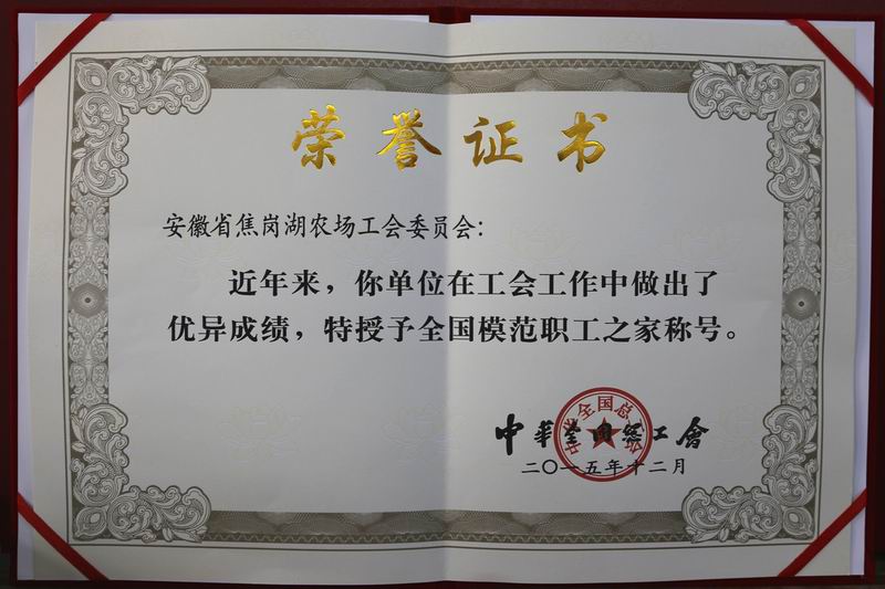 近年来,安徽农垦焦岗湖农场在工会工作中做出了优异成绩,在中华全国总工会近期开展的基层模范组织评选中,荣获全国模范职工之家称号。(刘慧君)