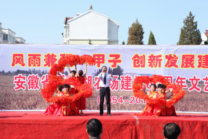 126,安徽潘村湖农场场部大院歌声飞扬、锣鼓喧天,一台由职工群众自编自演的庆祝农场建场60周年文艺汇演正在这里举行。