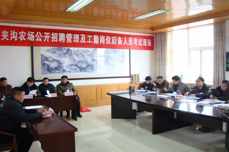 21,安徽夹沟农场面向全场公开选聘管理及技能后备人才面试工作举行。省农垦集团人力资源部长洪浩、场党委书记温广信分任正副主考官参加了面试评分,场纪委、组人科和职工代表全程参与并监督了现场计时计分和公布分数。