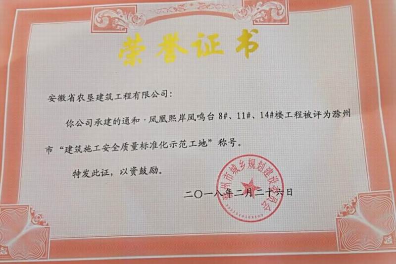 近日,垦建公司承建的通和·凤凰熙岸凤鸣台”8#11#14#楼和优诗美地”27#-38#楼两项工程,分别被滁州市、宣城市主管部门评为建筑施工安全质量标准化示范工地称号,优诗美地项目经理程成荣评优秀项目经理