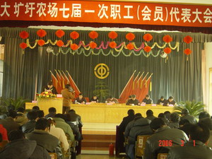 春回大地,万象更新。3月1日,大圹圩农场七届一 次职工(会员)代表大会在场部礼堂隆重召开。来 自全场各单位79名职工代表怀着高度的主人翁责任 感济济一堂,共商农场发展大计。场领导徐成银、 施广庆、殷文格、杨朝幸、李家华、沈永辉在主席 台前排就坐,天长市总工会领导到会表示祝贺。