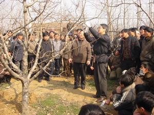 砀山果园场近几年产品结构调整较快,引进了不少 日韩梨品种,现大部分已进入盛果期。为了让广大 职工迅速掌握外来品种梨的特性,场领导采取多种 方式进行有效培训。3月1日上午,在砀山县农委主 任杨鹏程的陪同下,日本果树专家香取茂男先生来 到砀山果园场,在七分场的15眼,他实地观察了圆 黄梨的区域反应。针对职工们已剪过的圆黄梨树, 香取茂男提出了自己的看法,并与砀山果园场的分 管场长及技术专家交换意见后,更改调整了部分剪 口。